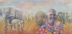2017Compositie van een kudde olifanten met op de voorgrond een kleine Masaï familie