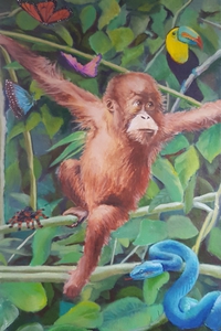 Orang oetang voor LoekBaby orang oetang in de jungle omgeven door kleurrige diertjes