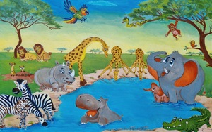 2025Afrikaanse waterplas met verschillende dieren, geschilderd in cartoonstijl